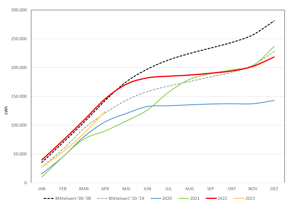 Die erste Grafik zeigt, wie viel Strom im Monat produziert und ins Netz des Überlandwerks Schäftersheim GmbH eingespeist worden ist. In den Sommermonaten geht die Produktion regelmäßig zurück, obwohl es nicht wesentlich weniger regnet als im Winter. Allerdings verdunstet im Sommer wegen der höheren Temperaturen viel mehr Wasser als in der kalten Jahreszeit. Außerdem nimmt die Vegetation im Sommer mehr Wasser auf.